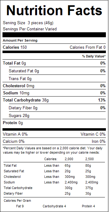 Ingredients: Corn Syrup, Sugar, Modified Food Starch (corn), Artificial Flavor, Red 40. **Manufactured in a facility that also manufacture’s products containing eggs.