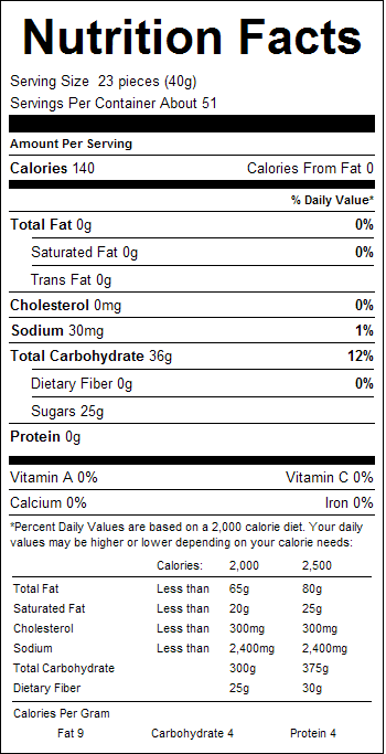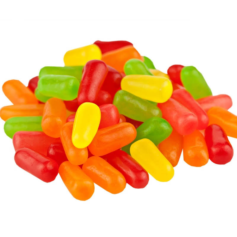 Ingredients: Sugar, Corn Syrup, Modified Food Starch, Fruit Juice from Concentrate (pear, orange, strawberry, cherry, lime, lemon), Contains Less than 2% of the Following: Citric Acid, Malic Acid, Fumaric Acid, Sodium Citrate, Natural and Artificial Flavors, Dextrin, Confectioners Glaze, Carnauba Wax, Medium Chain Triglycerides, Red 40, Yellow 5 (tartrazine), Yellow 6, Blue 1. **Gluten Free.