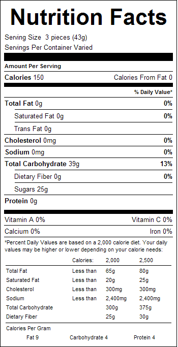 Ingredients: Corn Syrup, Sucrose, Food Starch- Modified, Dextrose, Natural and Artificial Flavors, Yellow 6 and Red 40. **Manufactured in a facility that also manufacture’s products containing eggs.