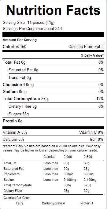 Ing: Sugar, Corn syrup, Hydrogenated palm kernel oil, Less than 2% of the following: Citric acid, Tapioca dextrin, Modified corn starch, Natural and artificial flavors, Sodium citrate, Colors (Yellow 5 lake, Red 40 lake, Yellow 6 lake, Blue 2 lake, Titanium dioxide, Blue 1 lake, Blue 2 lake, Yellow 6, Red 40, Yellow 5, Blue 1, Carnauba wax.