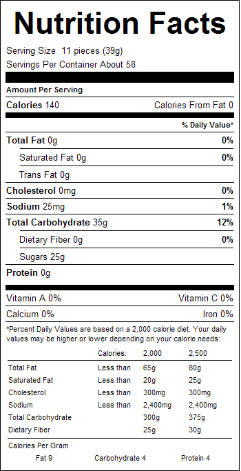 Ingredients:Sugar, Invert Sugar, Corn Syrup, Modified Corn Starch, Citric Acid, Tartaric Acid, Natural and Artificial Flavoring, Titanium Dioxide, Red 40, Yellow 5 and Blue 1.